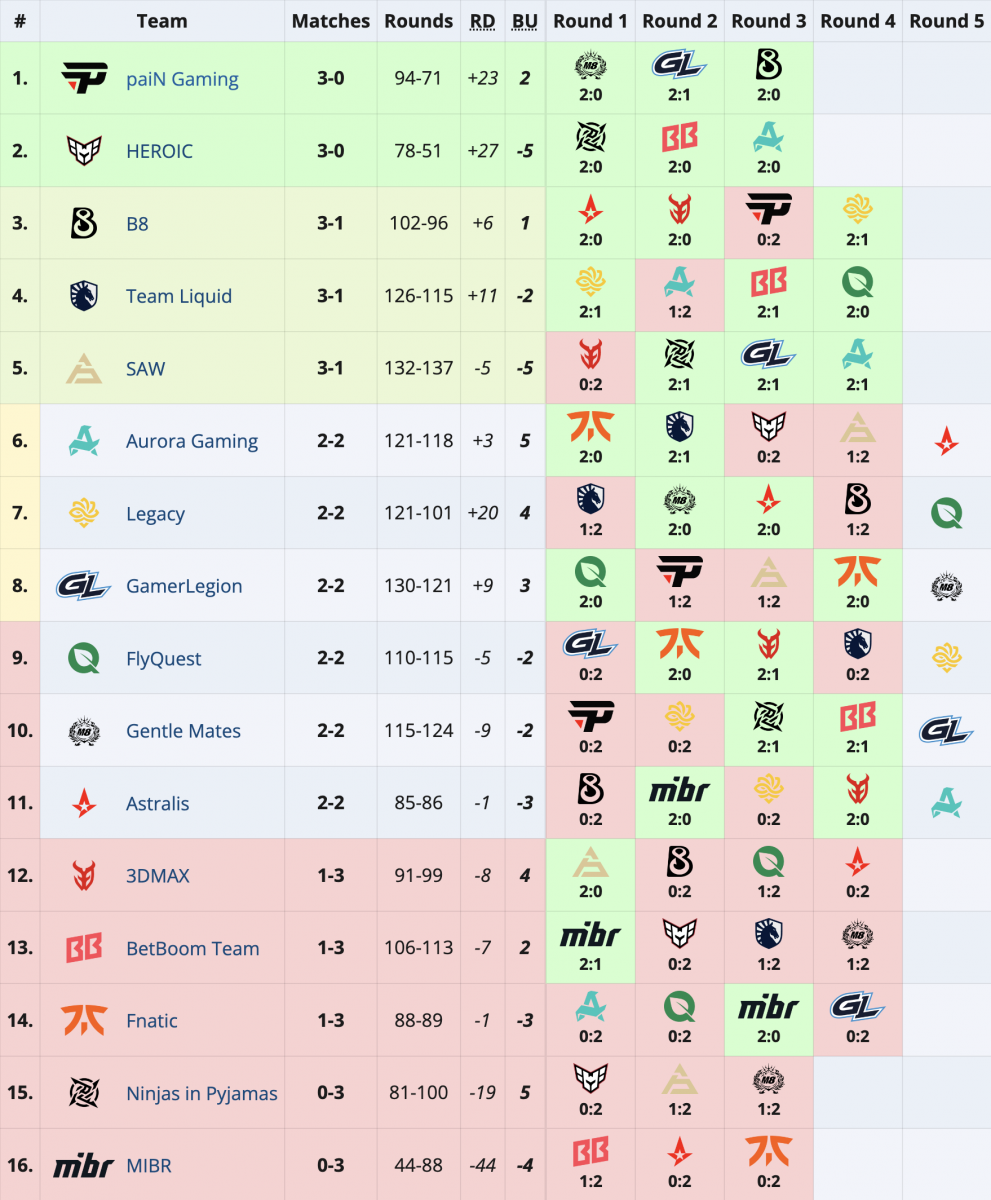 此外今日还有三支队伍结束本届赛事旅程:3DMAX在瑞士轮第四轮不敌Astralis,BetBoom Team负于Gentle Mates,而fnatic则被GamerLegion淘汰。这三支战队最终均以1胜3负的成绩告别赛场。